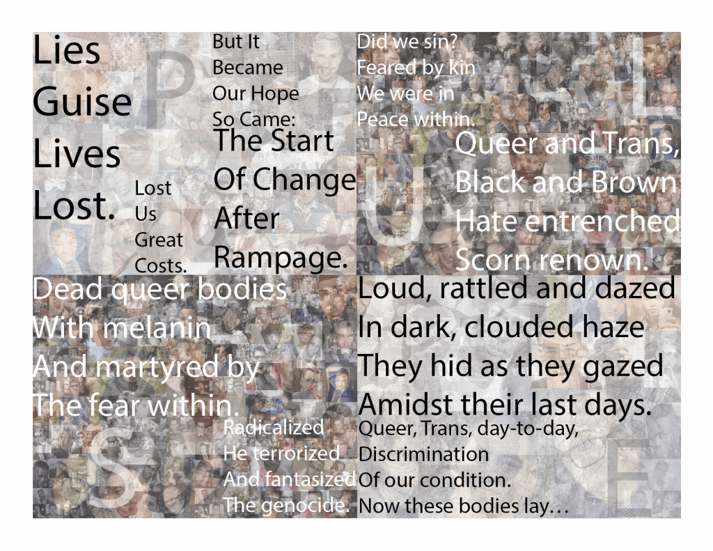 On June 12, 2016, a horrific attack on the Queer and Trans communities took place at Pulse Nightclub in Orlando, FL. As a result, 49 lives were taken, culminating in the largest mass murder on American soil since the 9/11 terrorist attacks. I created the following poem and subsequent artwork in memory of the lives lost in this massacre. Everyone named died too soon at the hands of an anguished gunman. May they rest in peace and power and may their deaths not be in vain.