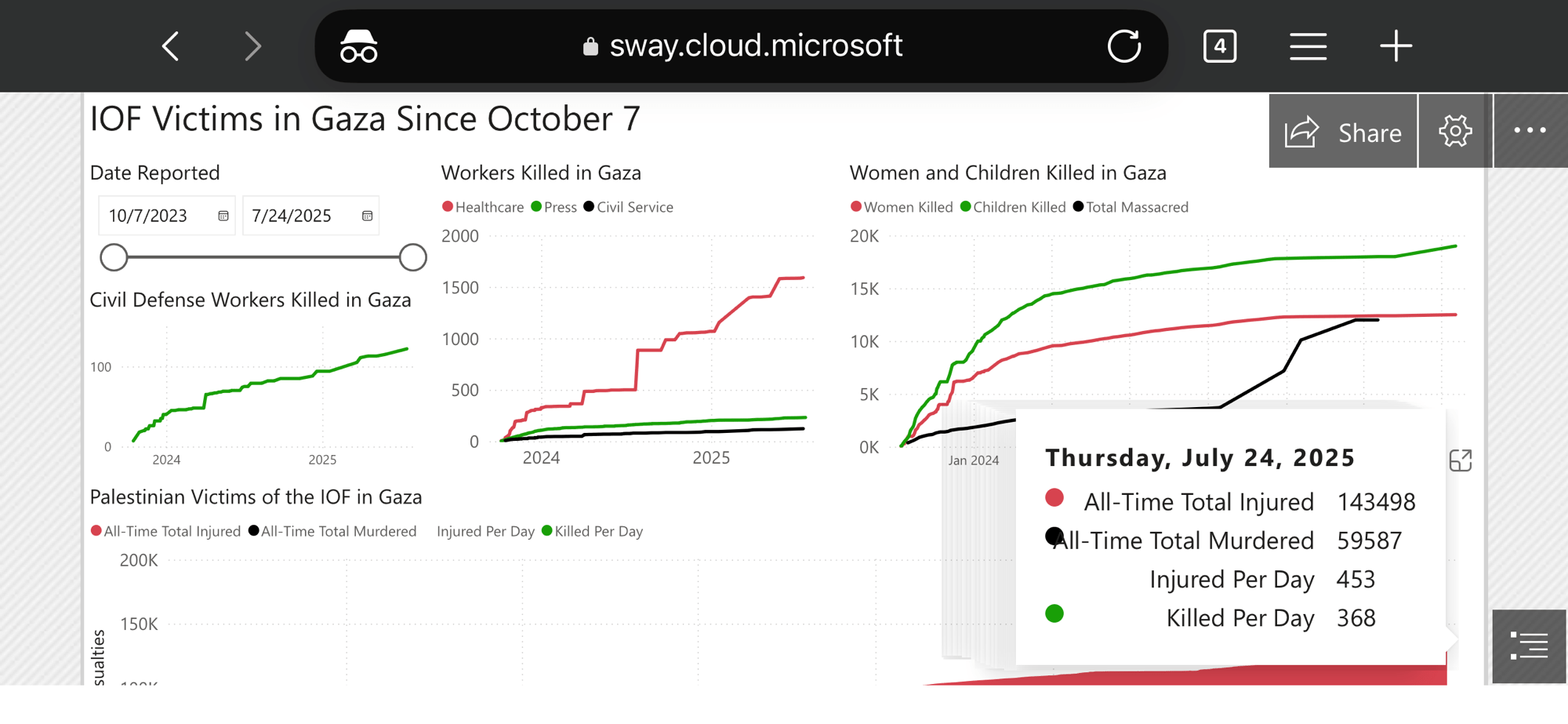 The images above are a screenshot of the moment that the Flotilla account on Youtube announced the kidnapping of their comrades and a screenshot of a dashboard that I created to track the direct murders of Palestinian civilians in Gaza using data from Tech For Palestine. As of July 24, 2025, 59,587 Palestinian civilians were directly murdered by the IOF. Of course, indirect deaths, including those due to infections that occurred as a result of injury, famine and starvation due to the IOF blockade, and a lack of proper medication to treat those with chronic illnesses, are not included in these figures.