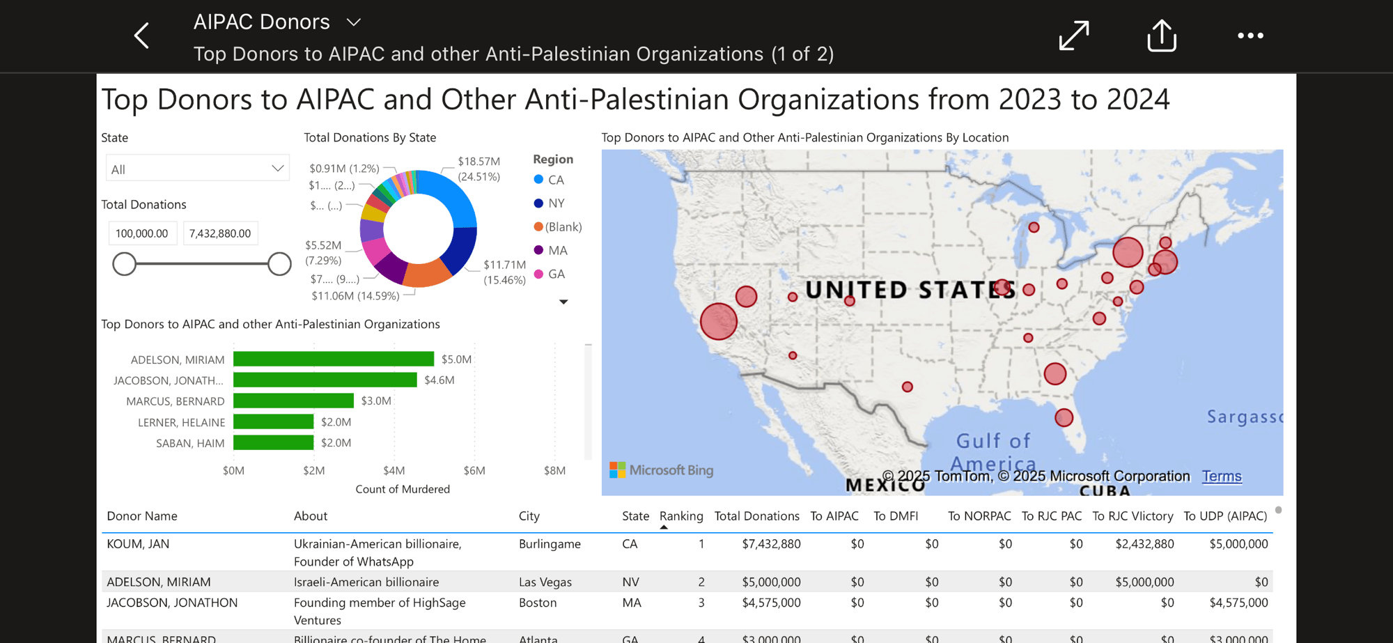 AIPAC, the most notorious pro-Israel and anti-Palestinian lobbying group in the United States, is backed by American billionaires, used to siphon billions of American tax dollars to uphold and support the government of Israel as it commits atrocities against the indigenous peoples of Palestine. A snapshot of a dashboard that I created on this matter is shown below: